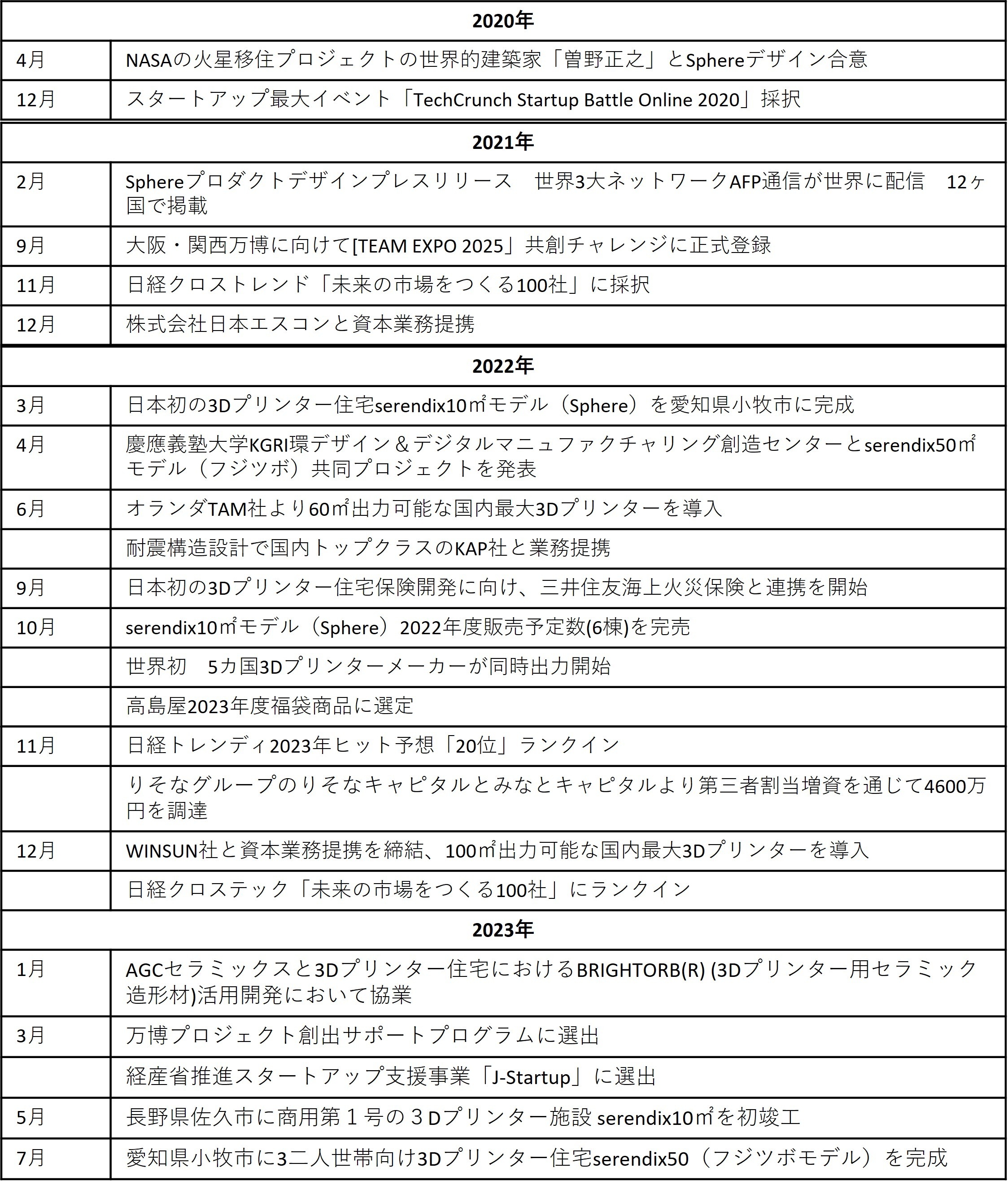 セレンディクスでは2022年3月に日本初の3Dプリンター住宅 serendix 10(スフィアモデル)を23時間で完成以降、2023年5月には一般販売棟第1号であり商用初となる佐久棟、先月末には日本初の二人世帯向け3Dプリンター住宅 serendix50(フジツボモデル)を愛知県小牧市に竣工させ、誰もが「車を買える価格で家を購入できる」社会の実現に向け邁進してまいりました。