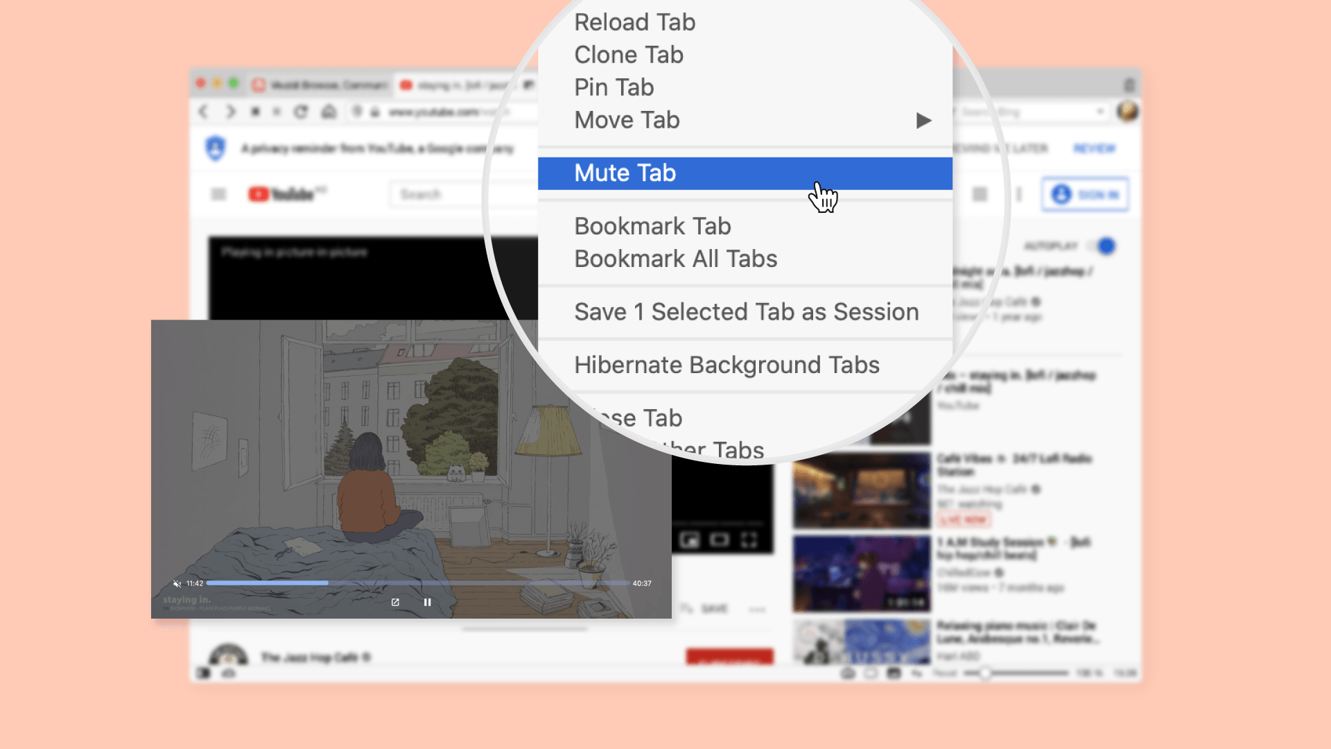●ミュートボタンを追加:Vivaldi 3.2では、ポップアウト動画の音声をミュートにできるボタンを追加しました。ミュートボタンは、ステイホームや在宅勤務の時間が増えた昨今には特に便利な機能です。突然のオンライン会議、家族からの声かけ、その他動画の音声を即座にオフにできます。