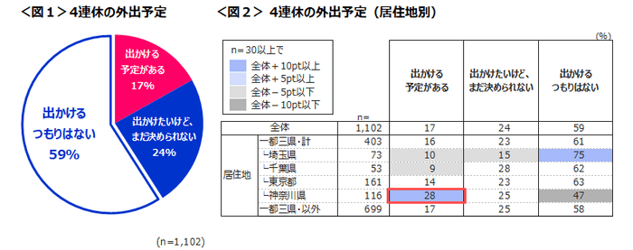 居住地別にみると、【一都三県・計】と【一都三県・以外】では大きな差がなく、【神奈川県】で「出かける予定がある」人が3割弱と高い。<図2>