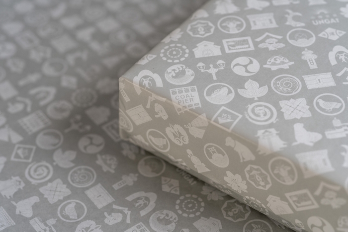 小樽の名所、名物をアイコンで表現したオリジナル柄の包装紙で包装いたします。