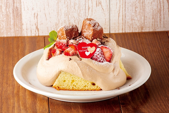 シフォンは甘さ控えめのものを使用。濃厚な生チョコクリームの味わいを邪魔しない相性抜群の食感に仕上げました。トッピングには旬のいちごをあしらい、一層後味すっきりといただけます。
