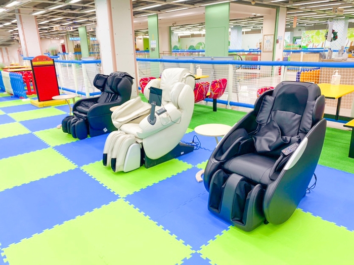 キッズランドUSでは飲食持込自由ですので、お昼ごはんやおやつタイム等、くつろぎコーナーで憩いのひとときをお過ごしください。京都八幡店ではマッサージチェアを設置しておりますので、保護者様も一息ついて日々の疲れを癒していただけます。