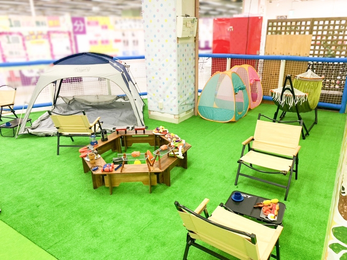 テントやハンモック等の本格的なキャンプ用品が設置されているキャンプコーナーでは、親子でキャンプ用品を使ったごっこ遊びを楽しんだり、アウトドアチェアに座ってゆったりキャンプ気分を満喫したり、様々な過ごし方をお楽しみいただけるエリアです。