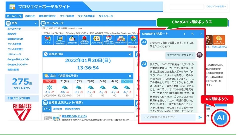 クラウド環境、サテライト環境でのビジネス支援に特化したインターネットシステムソリューションベンダーである株式会社サテライトオフィス(本社:東京都江東区、代表取締役社長:原口 豊、 https://www.sateraito.jp )は、Google Workspace 導入企業向けに提供しているアドオンツール「ポータルサイト機能」に対話型AI「ChatGPT(チャットGPT )」を利用した相談機能を追加したことを発表します。ポータルサイトから、「AI」アイコンをクリックするだけで、直接、ChatGPT に質問が可能です。新たに立ち上げたAIソリューションブランド「サテライト.AI」の第2弾となります。