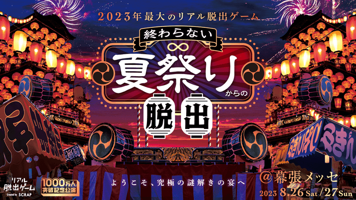 全世界で累計1,090万人以上を動員しているリアル脱出ゲームを企画制作する株式会社SCRAP(本社:東京都渋谷区、代表:加藤隆生)は、2023年最大のリアル脱出ゲーム『終わらない夏祭りからの脱出』を幕張メッセにて8月26日(土)27日(日)の2日間限定で開催することを発表いたします。