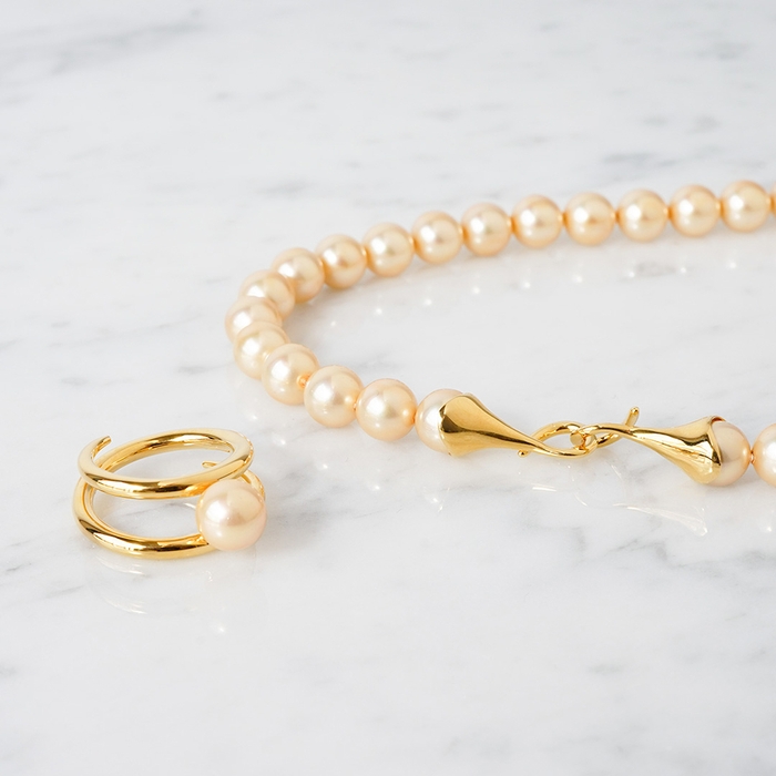 見た瞬間からワクワクして、身に着けた瞬間から装う楽しさを思い起こさせてくれるカラーパール。オーロラのような艶と輝きを出す加工を行った「ミガキ貝パール」を使用しており、南洋真珠のゴールドカラーを見事に再現いたしました。本物を知る大人の女性が気兼ねなく普段使いできます。