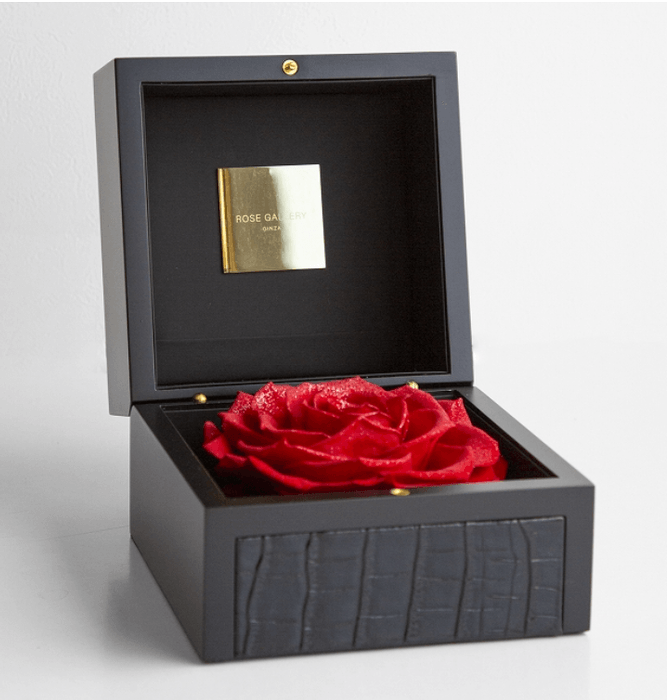 バラの花弁を1枚1枚丁寧に開かせ、直径約9~10cmもの大輪サイズに仕上げた圧倒的な存在感を誇るタイムレスローズ。そのバラの花びらに、希少な天然ダイヤモンドパウダーを散りばめた人気シリーズのダイヤモンドローズ。