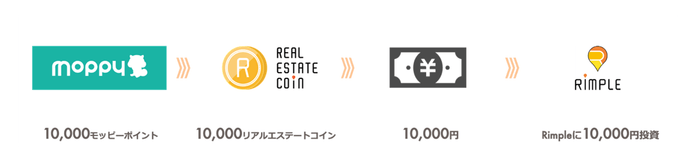 「モッピーポイント」1ポイントを「リアルエステートコイン」1コインに交換いたします。「リアルエステートコイン」への交換を希望されるお客さまは、事前に「Rimple」の会員登録を完了していただき、「モッピー」ウェブサイトより交換サービスの申込みをお願いいたします。最低交換単位は1,000ポイントとなります。
