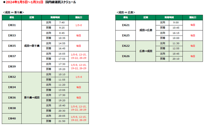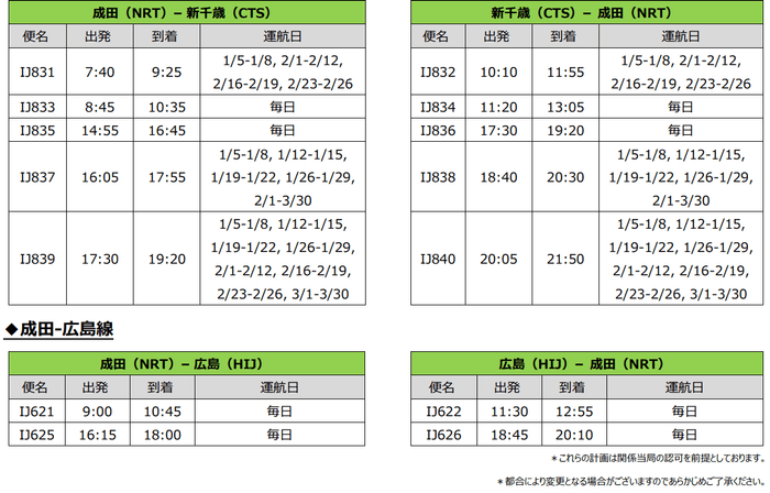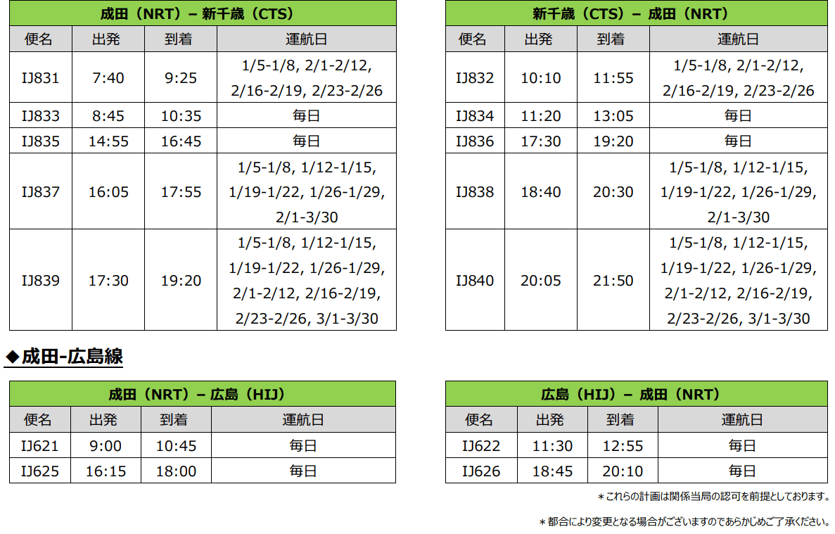 JALグループのLCCであるスプリング・ジャパン株式会社(以下:スプリング・ジャパン)は本日15時より、2024年1月5日(金)から3月30日(土)までの成田=新千歳線、広島線の販売を開始します。