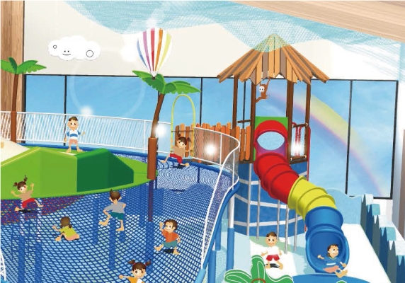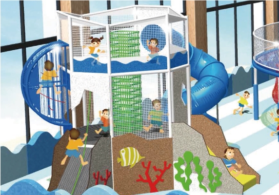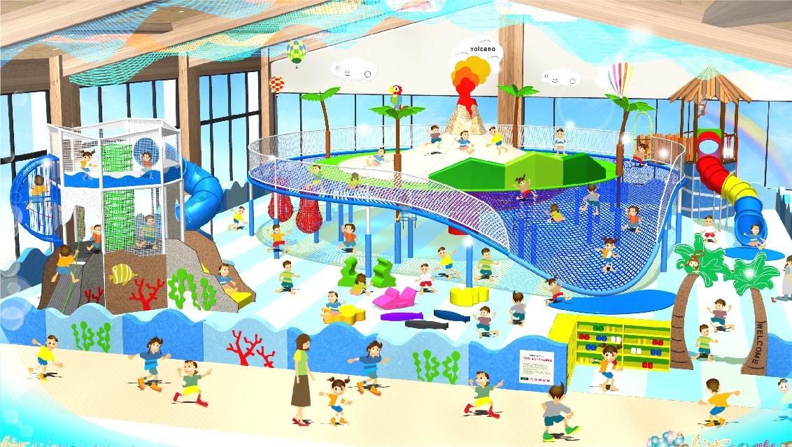 キッズパラダイス内に新たに設置される「南の島の大冒険」は、温かな南の海とそこに浮かぶ火山島をイメージした巨大な屋内アスレチック遊具です。
