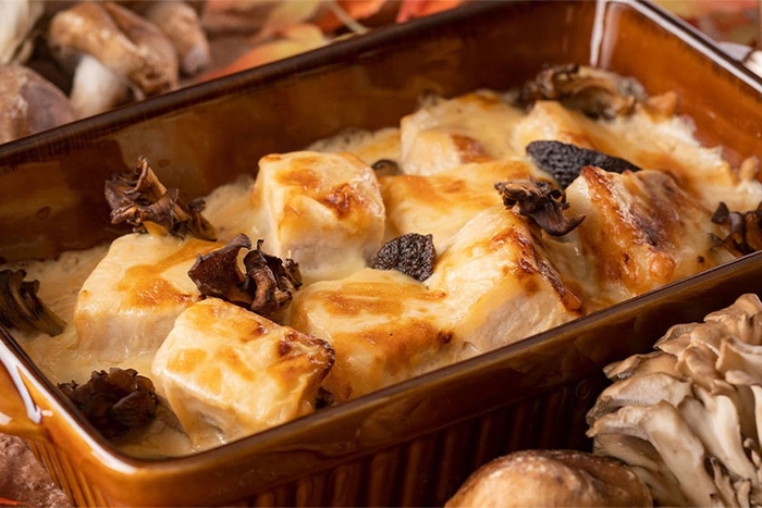 右)厳しい認定基準に合格した豚肉だけが名乗れる「甲州富士桜ポーク」を使ったクリーム味噌グリル。白味噌を加えたベシャメルソースのコクが、豚肉の美味しさを引き立てます。