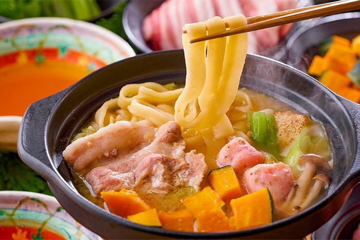左)山梨県の郷土料理「ほうとう」は、お好きな具材と出汁をお選びいただき、お席で出来たて熱々をお楽しみいただけます。