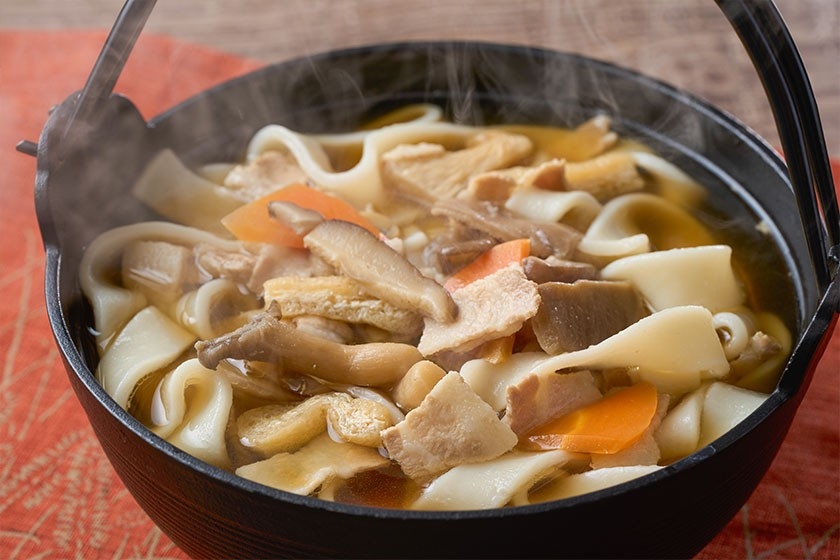 左)群馬県の郷土料理おっきりこみうどんは、旬の野菜と幅広麺を煮込んだ体が温まる一品です。