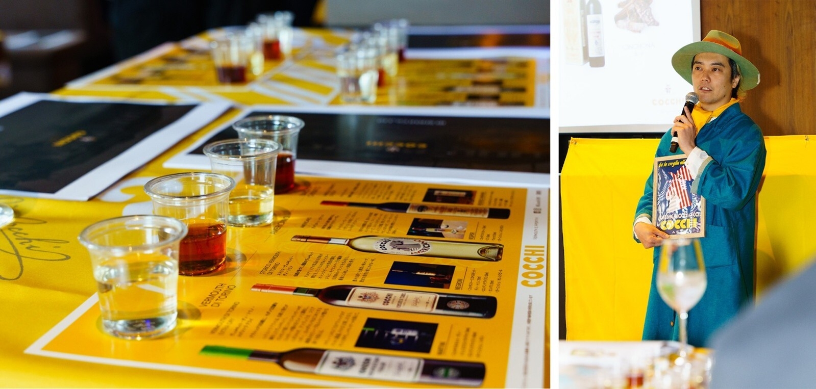 テイスティングでは、『Bar NOW』(川崎市)と『Bar Prima』(横浜市)のオーナーバーテンダー安里 勇哉氏が、COCCHIベルモット4種をバーテンダーならではの視点で紹介。ウェルカムドリンクとして用意したアメリカーノ・ビアンコのソーダ割りに続き、安里氏考案のマティーニ(エクストラドライ使用)とネグローニ(ストーリコ使用)が振る舞われ、参加者はコッキの多彩な可能性を体験しました。