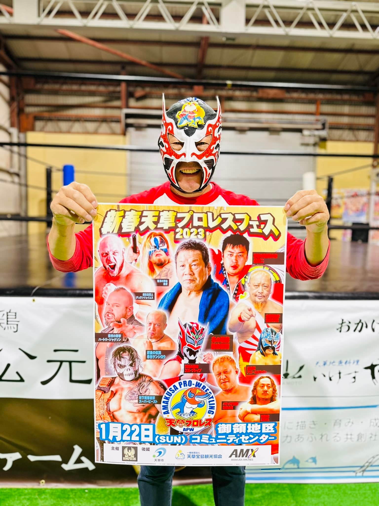 今回のツアーでは、プロレス殿堂館リングサイドと連携し、「新春天草プロレスフェス2023」と銘打ったプロレスのイベント開催をおこない、藤波辰爾選手をはじめ10数名のレスラーと、地元天草市出身のお笑いコンビ「ガリットチュウ」さんにもイベントを盛り上げていただく内容になっています。