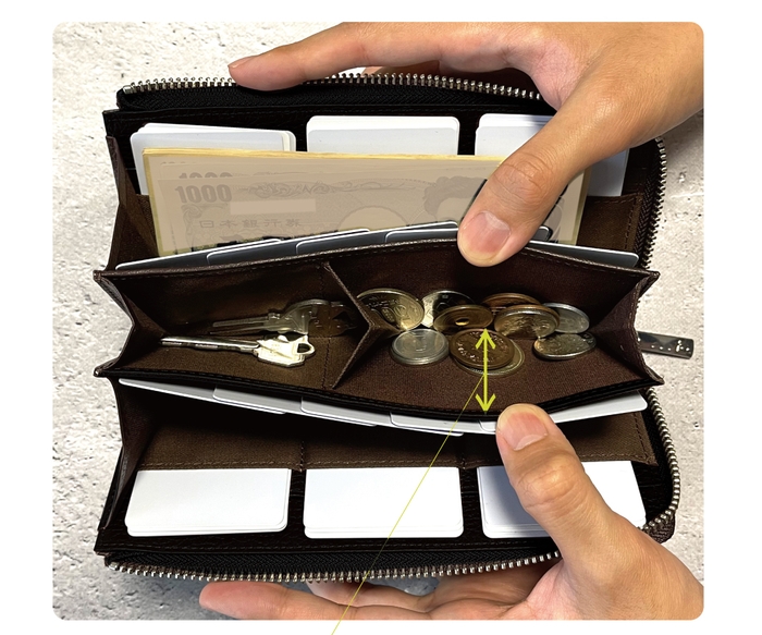 一般的な長財布は、小銭入れスペースが深く「小銭の出し入れがしづらい」というお声をいただき、独自設計による小銭スペースの仕様で特許庁意匠登録を取得。これにより小銭スペースの出し入れがとても快適になりました。