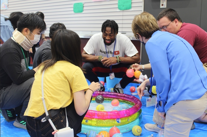 3日目の28日には学食で学生たちと昼食をとった後、英語の授業にも参加。A1号館地階に設けた「夏まつり」会場で、風船のヨーヨー釣りに挑戦するなど、日本の夏の風情を楽しみました。