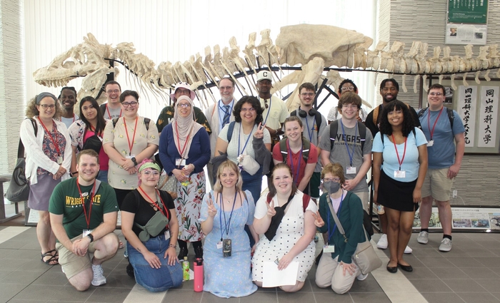 続いて、A1号館1階エントランスで、全長約10メートルのアジア最大の肉食恐竜「タルボサウルス」を目の当たりにすると、歓声と驚きの声が上がりました。この日は、理大に続いて、岡山後楽園や吉備津神社を見学しました。