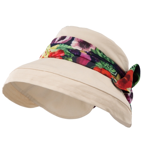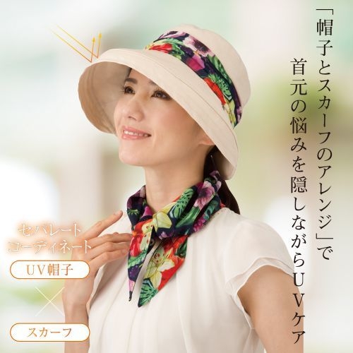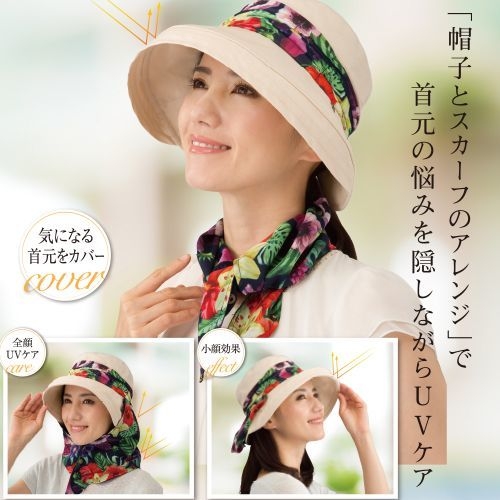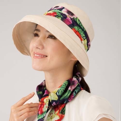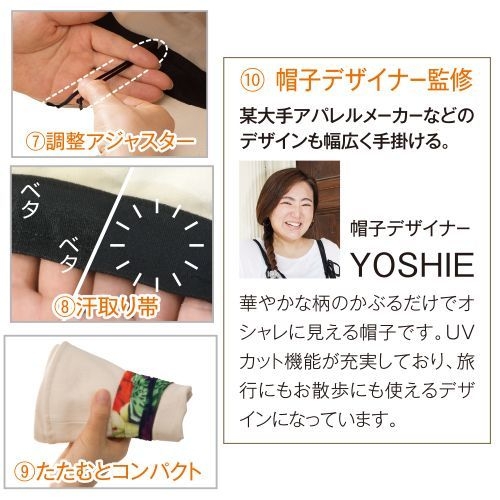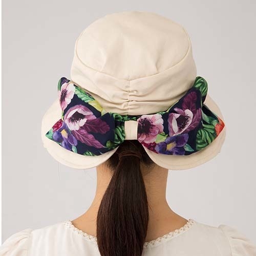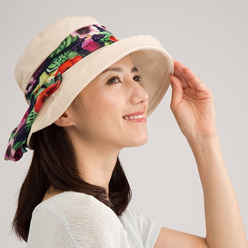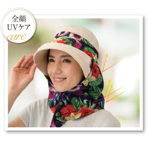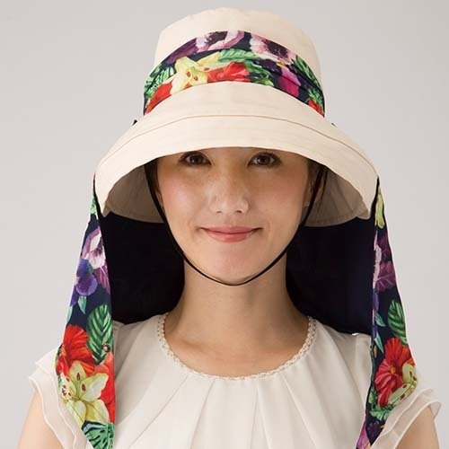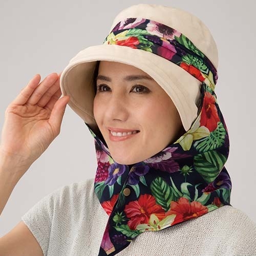 ボタニカル柄が華やかな3通りのアレンジができるUV帽子 ~紫外線を99%カット。フェイスラインも首も徹底ガード~