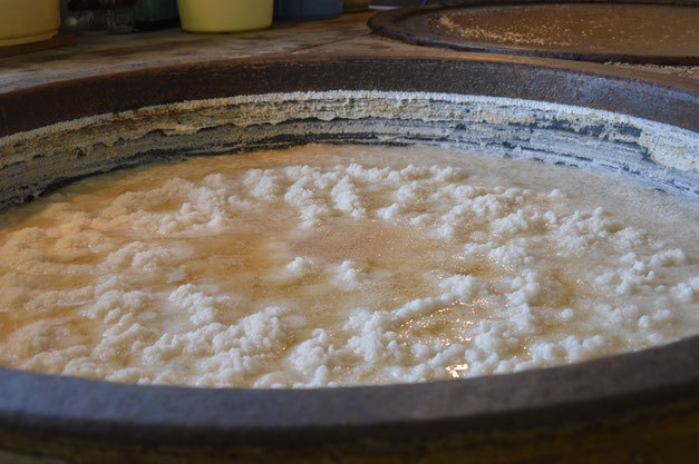 これを大釜に入れ、薪でじっくりと炊き上げてつくる製法が揚げ浜式製塩です。この製法は、五百年程前から奥能登に守り伝えられてきたと言われています。