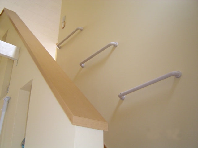 取引先の金物屋さんから「おしゃれでちょっと変わった手摺はありませんか?」とお問い合わせがあり、ご提案したのがデザイン性に優れた「愛ぼうくん」でした。通常の階段用手摺と言えば下階から上階に向けて一本に伸びているのですが、やや圧迫感があります。そこで今回は写真のように愛ぼうくんを平行させ組み合わせました。住まい作りには、アイデアがとても重要だということを教えてくれたケーススタディです。