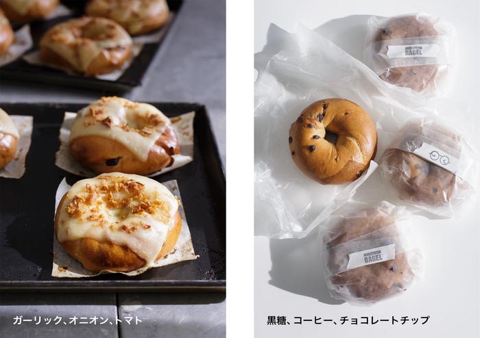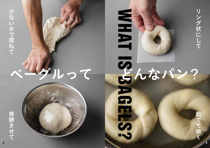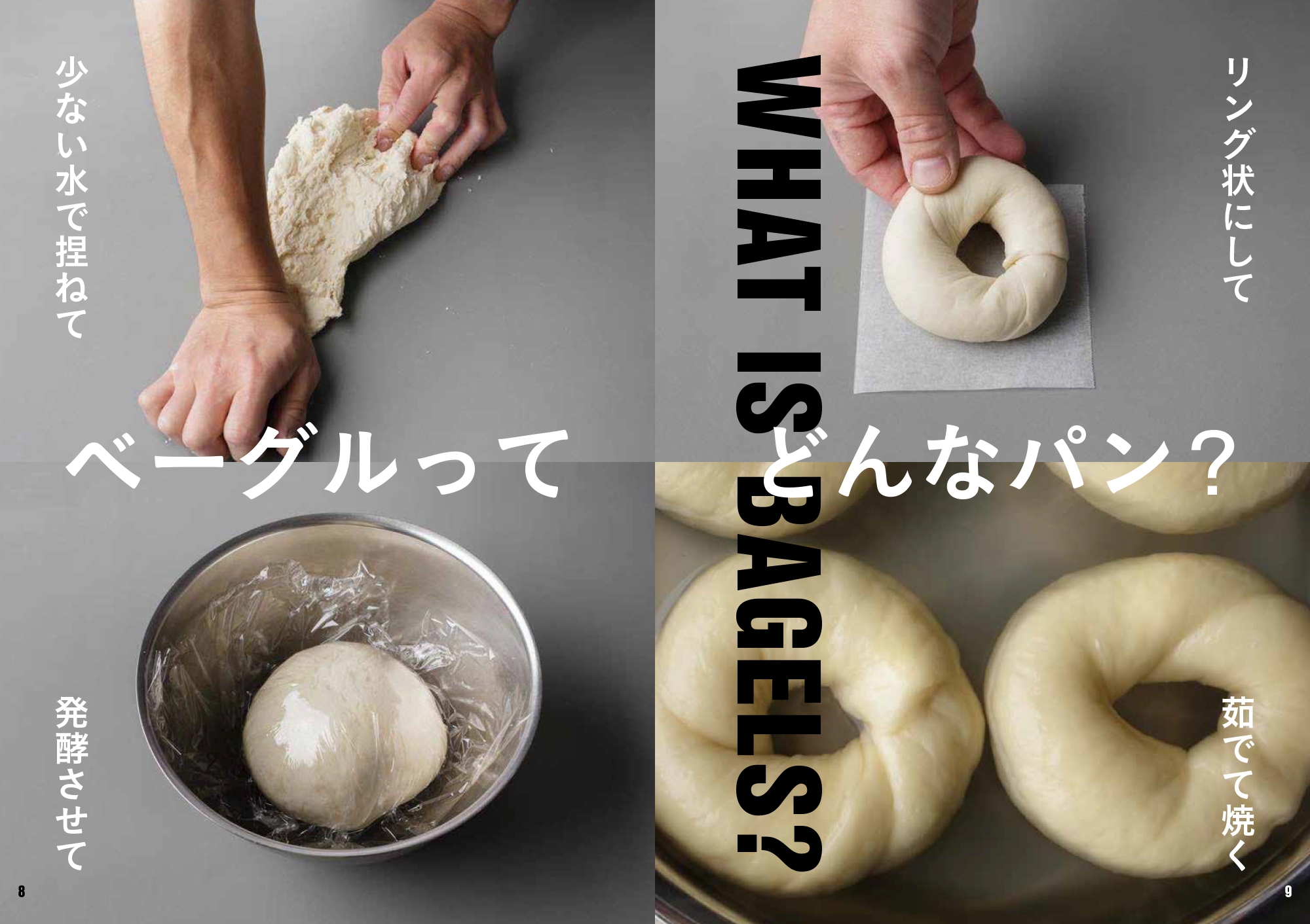 ふわもちベーグル◎ プレーン・はちみつとオートミール・アールグレイとオレンジピール・グリーンオリーブ、アンチョビ、タイム・よもぎ、小豆、きなこ/もちもちベーグル◎ プレーン・抹茶、クランベリー、レモンピール・黒糖、コーヒー、チョコレートチップ・プロセスチーズとローズマリー・ごまごま/むっちりベーグル◎ プレーン・シナモンとブルーベリー・いちじくとくるみ・ガーリック、オニオン、トマト・かぼちゃと豆乳/いろんなベーグル◎ クリスピーのプレーン・クリスピーの柚子、山椒、白味噌・マーブルのココアと練乳・マーブルのイカスミとパプリカ・おやきの野沢菜と青じそ・おやきの焼きいも、メープルシロップ、くるみ・プレッツェル・編み込みソーセージ/ベーグルサンドと楽しむ。クリームチーズ/ベーグルで楽しむ。サンドイッチ/コラムColumn◎ ①「粉で変わるベーグル」②「水分量で変わるベーグル」③「焼成温度と時間で変わるベーグル」④「ねじり成形で食感の変わるベーグル」⑤「湯種と発酵種で変わるベーグル」