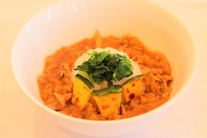 ・コンセプト:インド南西部発祥のカレー「ポークビンダルー」に、生姜、三つ葉、醤油、雑穀米などを添え「和」を意識した料理に仕上げる。店舗の原提供価格帯に合わせ、葉物野菜やカボチャ等のトッピングを添え、彩り豊かにすることも可能に