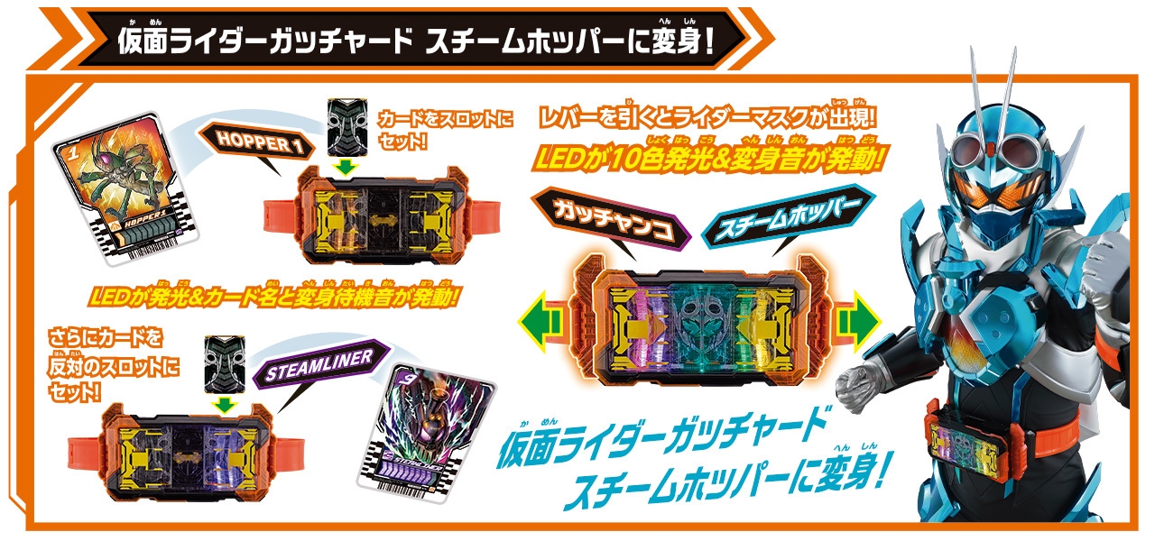 全100種類以上の「ライドケミートレカ」から、相性の良い2枚を選び、変身ベルトでガッチャンコ。「ライドケミートレカ」の組み合わせによって、仮面ライダーガッチャードの変身フォームが変化します。バッタのケミーである「ホッパー1(ワン)」と、蒸気機関車のケミーである「スチームライナー」をガッチャンコすると、「仮面ライダーガッチャード スチームホッパー」に変身します。