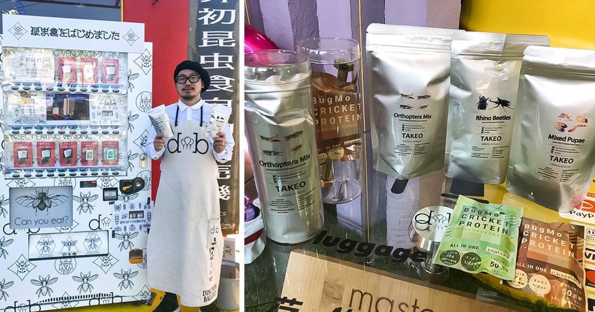 お店自体はバルーンショップですが、オーナーの遊び心から昆虫食を販売されています。自販機全体に昆虫をあしらい、インパクトのあるデザインになっています。