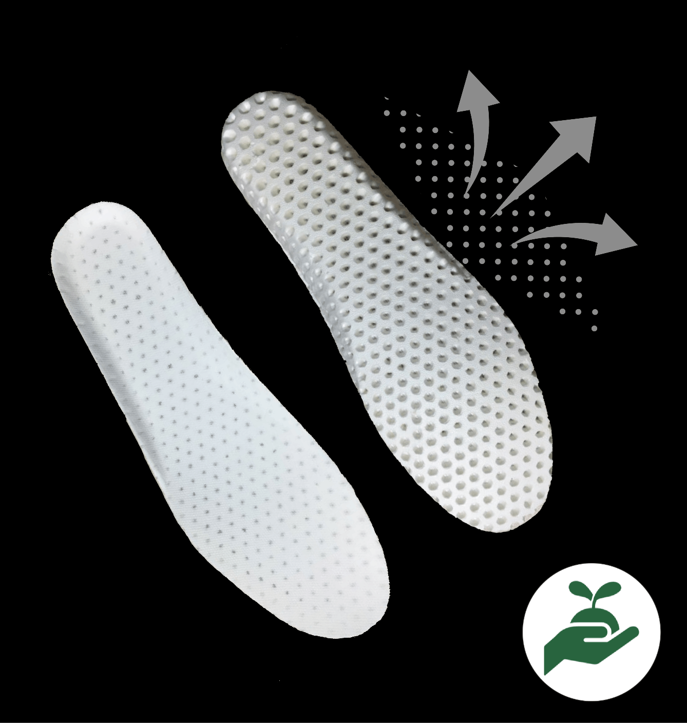 インソールは軽くて、柔らかい弾力のあるEVA素材を採用しています。インソール全体に無数の小さな通気口を開けることによって、素早く熱を外に逃がし、靴内部に熱がこもるのを防いでくれます。EVA素材は燃やしても有害物質を発生しないので、環境にも優しいエコな素材です。