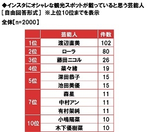 次に、インスタ(Instagram)にオシャレな観光スポットが載っていると思う芸能人を聞いたところ、1位「渡辺直美さん」(102件)、2位「ローラさん」(80件)、3位「藤田ニコルさん」(26件)となった。1位の渡辺直美さんは、インスタで多くのフォロワー(2019年7月時点で約900万人)を擁しているが、数多くアップされた写真の中に、旅行先のオシャレな写真を見つけた人が少なくないようだ。