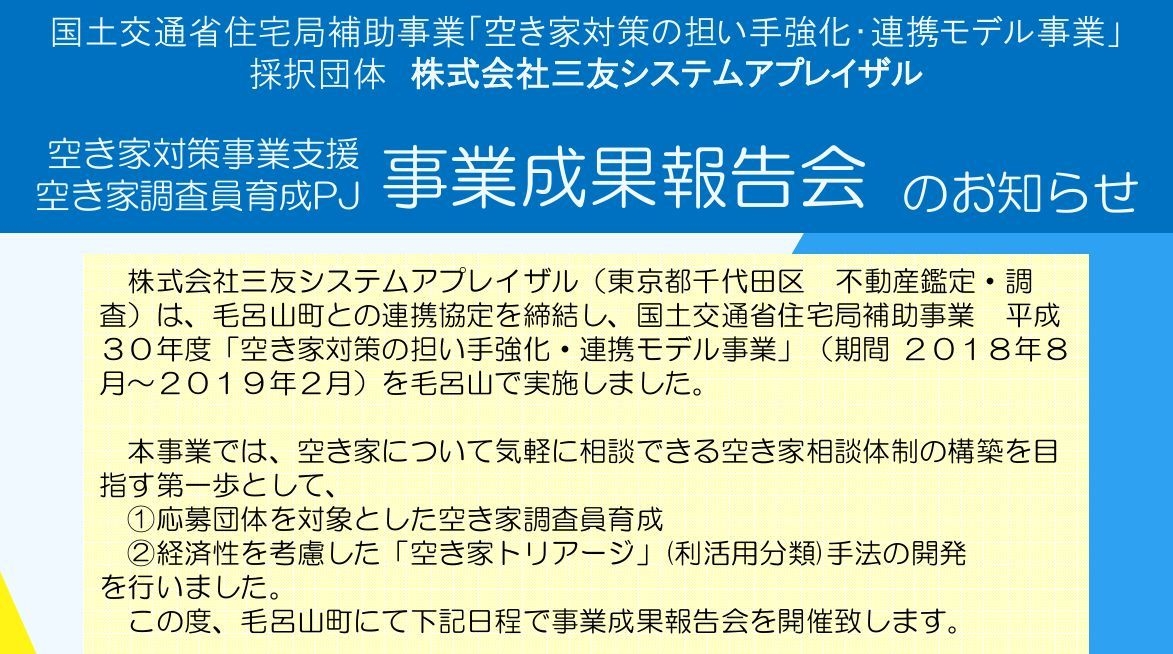 株式会社三友システムアプレイザル(本社:東京都千代田区、代表取締役社長:堂免 拓也)は、平成30年度「空き家対策の担い手強化・連携モデル事業」(国土交通省住宅局)に採択された「空き家対策事業支援・空き家調査員育成プロジェクト」(期間:2018年8月~2019年2月)の事業成果報告会を本事業の連携自治体である埼玉県入間郡毛呂山町において、2019年2月6日(水)に開催いたします。