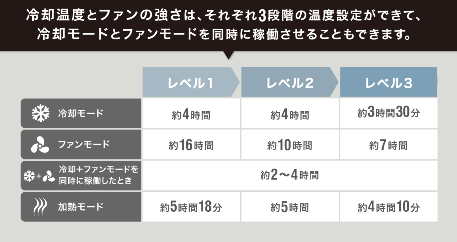 冷却加熱方式にはペルチェを採用しており、夏はファンモードや、クーラーモードで涼しく快適に過ごせ、冬はヒーターモードで首元を温める事ができます。また、それぞれ3段階の温度調整や風力調整ができるので体調に合わせて細かい設定が可能。