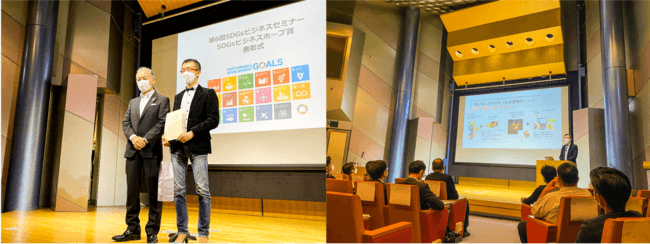 今回はプレゼンベンチャー企業のうち、SDGs研究所の志に近く、SDGsの活動として優れていたベンチャー企業に対し、「SDGsビジネスホープ賞」の表彰が行われました。「SDGsビジネスホープ賞」 とはSDGs研究所理事会員企業とコミッショナー、所長及びアドバイザーが「社会性」「持続可能性」「事業性」を審査基準とし、得点の高い上位2社を表彰するというものです。