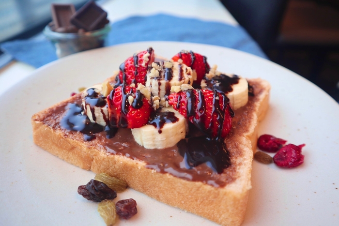 - 「生」食パンにお好みの量のチョコレートジャムを塗る。