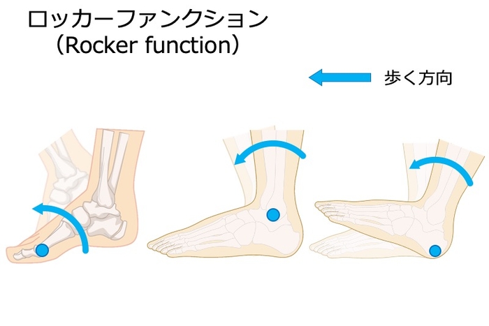 人間の歩行は、足が地面に接地した時に、踵の骨で前に転がったり、くるぶしや足指の関節部分が振り子の支点となり、重心が前にスムーズに移動していきます。このような動きをロッカーファンクションと言います。