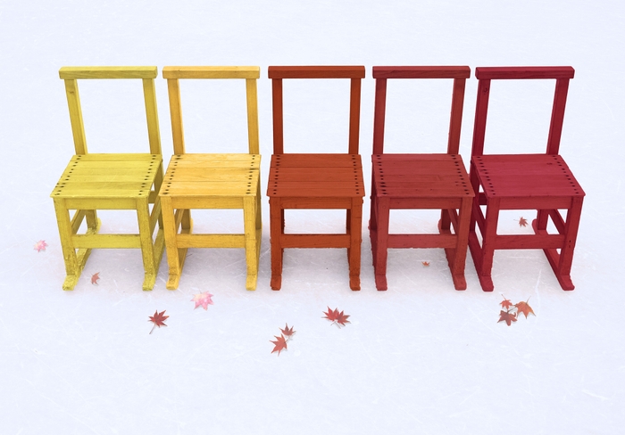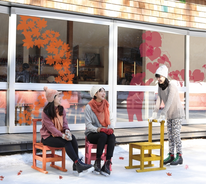 チーフにし、その個性的な葉の色とかたちをデザインしています。紅葉の色をペイントしたソリ付き椅子に揃えた色のため、好みの椅子を選び、オリジナル装飾の前で写真を撮れば、紅葉のスケートリンクの写真として映える一枚になります。