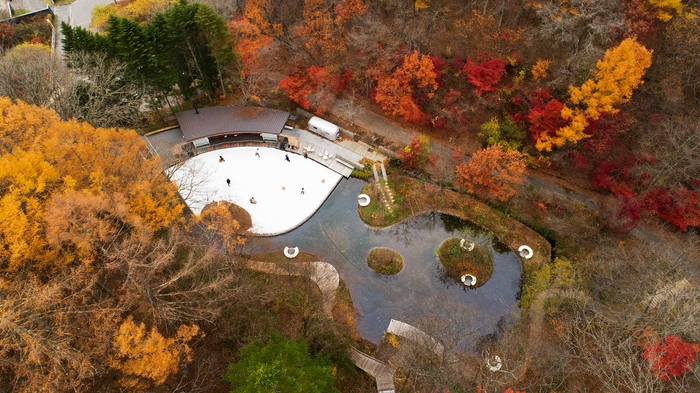 ケラ池スケートリンクは、森の中にある池が凍ってできます。軽井沢野鳥の森に隣接し、周辺には多くの野鳥や動物が生息しています。このような場所にあるため、スケーティングと共に周辺の自然も楽しんでいただきたいと考え、森を感じるスケートリンクをコンセプトとしています。今年は、芸術の秋にちなんで、色彩豊かな紅葉をアートとしても楽しめるコンテンツを新たに用意しました。