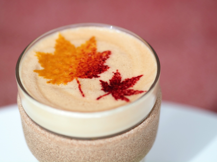 紅葉がひときわ美しい「イロハモミジ」と「コハウチワカエデ」をデザインした「紅葉カフェラテ」を提供します。「モミジ」の名の由来は、古くは草木が赤や黄色に変わることを「もみつ」と言い、その連用形で名詞化し「もみち」と呼ばれていたのが変化したものです。一方、「カエデ」は葉の切れ込みが浅いものを、カエルの手になぞらえ命名されたと言われています。その葉の違いを比べられるように、1杯のカフェラテの中にラテアートとして、並べて表現しました。カボチャパウダーを使用し、ほんのり甘い秋の香りが漂うカフェラテです。