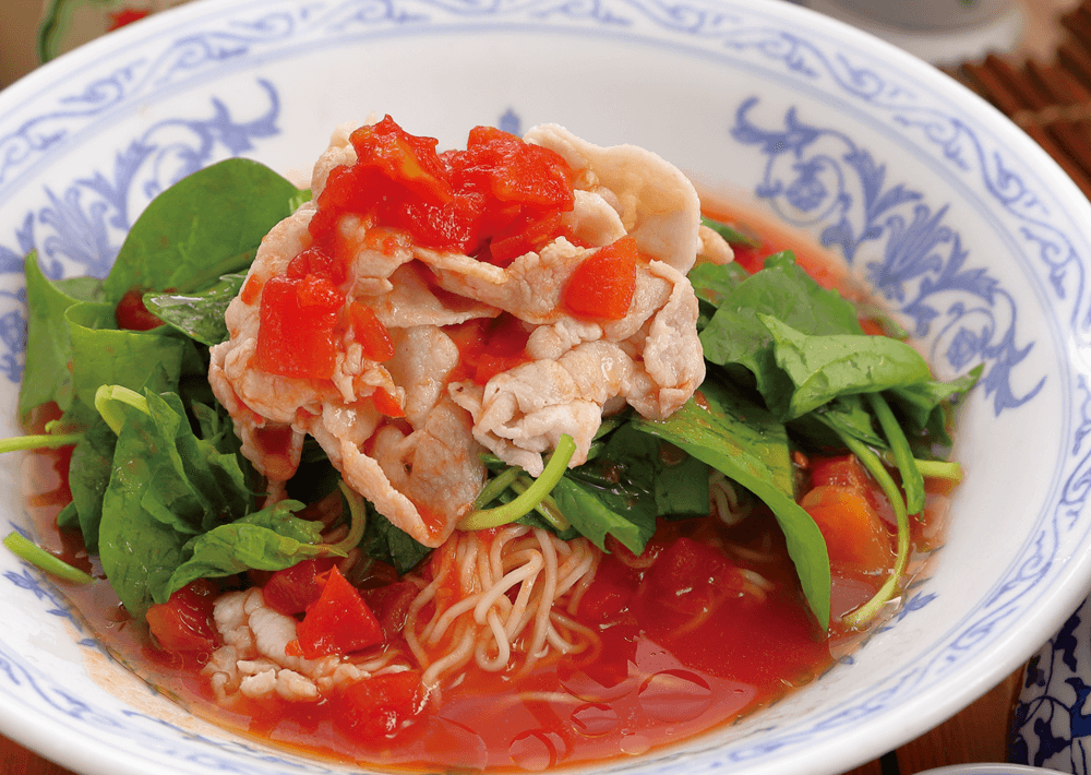 トマトのジューシーなコクと、シャキシャキとしたサラダほうれん草の食感、茹でた豚肉の旨味との相性は抜群!スープと具材を麺に絡めてお召し上がりください。