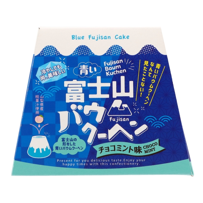 ■ 特徴 : 富士山型をしたバウムクーヘンで、バウムクーヘンの生地を青くすることによって富士山の山肌を演出、さらにホワイトチョコレートで富士山の雪を演出しよりリアルな富士山に見立てたバウムクーヘン。外側の山肌だけではなく、切った断面も鮮やかな青色となっています。