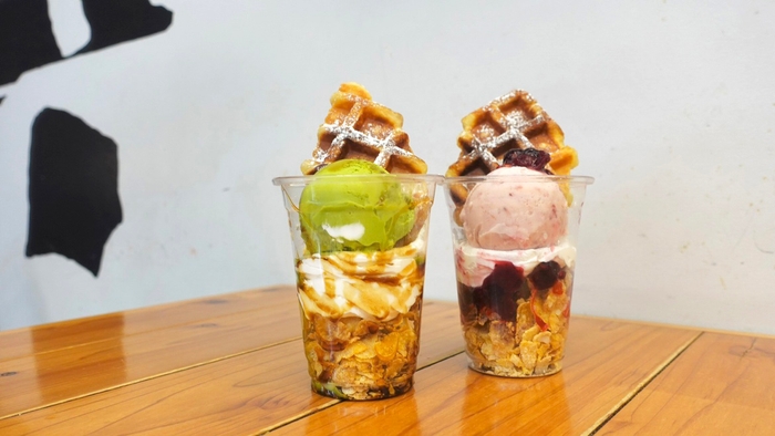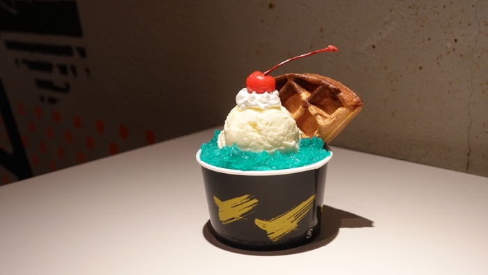 色鮮やかなラムネゼリーにバニラアイスとタピオカ粉を使用したもちもちのワッフルを浮かべ無人島をイメージ。ラムネゼリーの下には、生クリームやいちご、ブルーベリー、マンゴーのフルーツとワッフルが入っています。