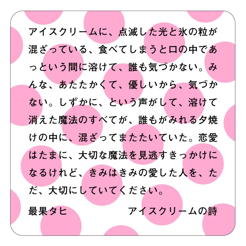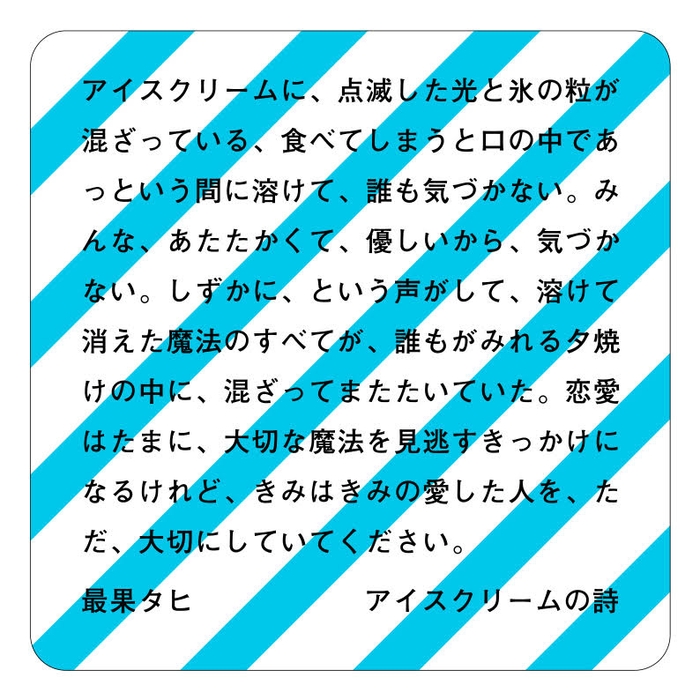 京都タワーサンド B1F FOOD HALLの一部店舗と大垣書店&CAFE イオンモール北大路店にて、最果タヒ氏の新刊出版を記念したオリジナルメニューを販売いたします。各メニューにはオリジナルコースターとピック付き(詩:最果タヒ氏書きおろし・各種デザイン:佐々木俊氏)。