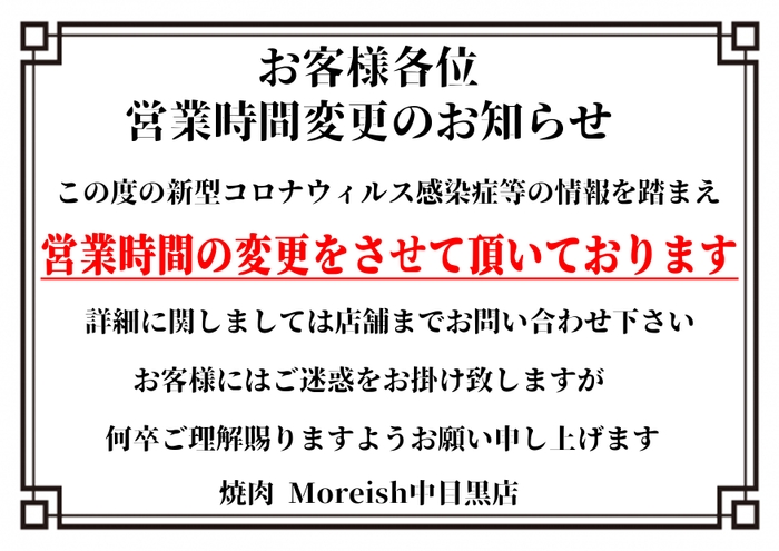 新型コロナウイルス感染拡大防止のための 営業時間に関するお知らせ