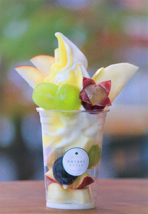 山形県産のラフランス、シャインマスカット、ピオーネ、りんごを贅沢にのせたパフェ。ソフトクリームはシャインマスカットとミルクのミックス。
