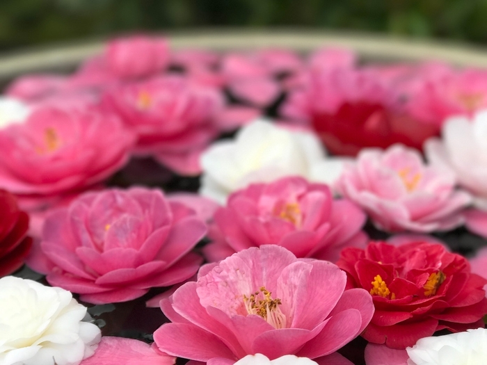 毎年庭園入口には、椿を用いたフォトスポットがあります。その時に咲いている椿があしらわれ、ピンクや白など色とりどりの色彩はフォトジェニック間違いなし。庭園内の小さな手水鉢には、椿が浮かべられていることも。