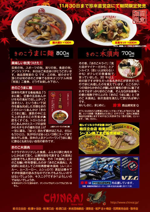 株式会社珍來(本社:千葉県船橋市、代表取締役社長:清水 延年、以下 珍來)は、『秋旨』フェアとして、「きのこ うまに麺」(800円・税込)と「きのこ 木須肉」(700円)を、珍來直営店(9店舗)で2017年9月1日から11月30日までの3ヶ月間限定販売を開始します。