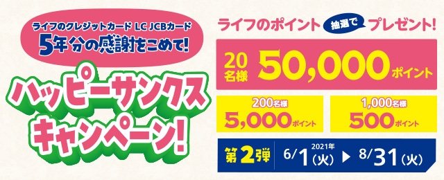 ライフのクレジットカード「LC JCBカード」を運営する株式会社ライフフィナンシャルサービスは、6月1日(火)から応募条件を満たされるカード会員様を対象に、抽選でライフのポイント最大50,000ポイントが当たる「ハッピーサンクスキャンペーン」第2弾を実施いたします。ライフアプリからエントリーいただき、キャンペーン期間中にライフをはじめ、ネットショッピングや公共料金、JCB加盟店でのお支払いなど、税込15万円以上のご利用でご参加いただけます。