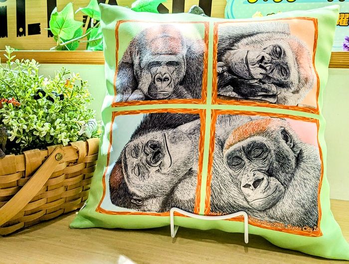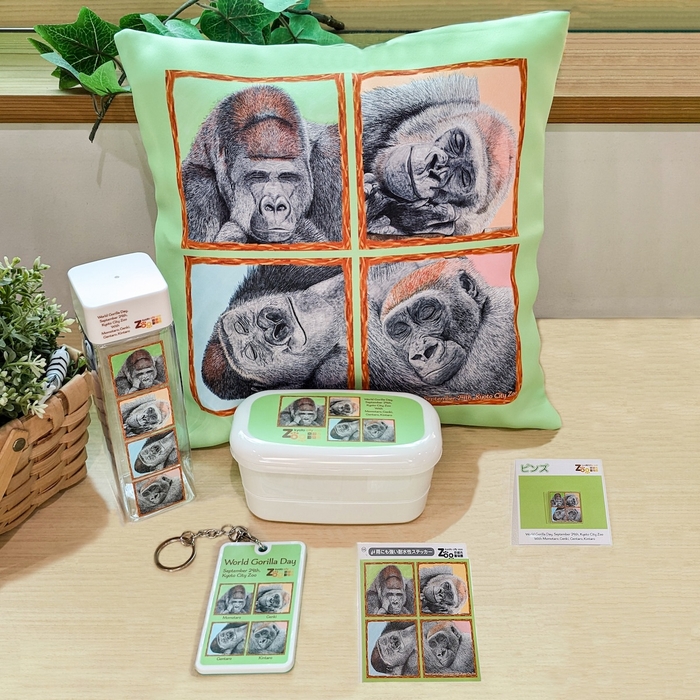 これまでも「ゴリランド」では、動物園監修のリアルなニシゴリラのぬいぐるみなどを常時販売してきました。今年の「世界ゴリラの日」限定グッズは、飼育担当者描き下ろしのイラストを用いて、クッション、ランチボックス、ピンズ、ICパス、クリアボトル、ステッカーの6種のグッズを製作・販売いたします。