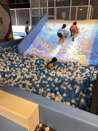 プロジェクターとKinect(※1)によって滑り台に南国を想像させる海中の映像をプロジェクションし、滑り降りることで海の中に飛び込むような演出を施しました。熱帯魚をイメージしたカラフルなお魚たちと戯れながら海の中に勢いよく飛び込む擬似体験が楽しめます。